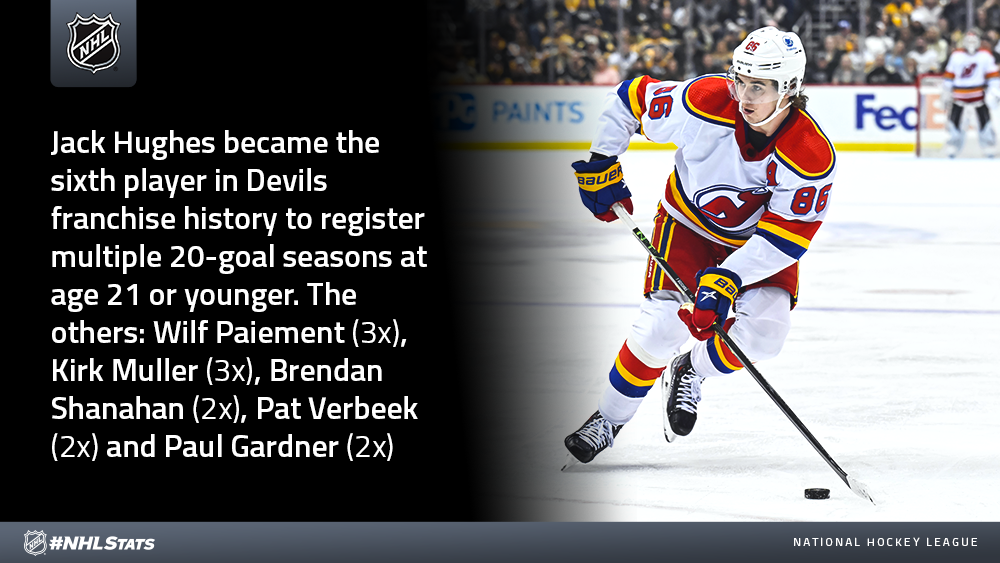 * After finishing with 26 goals in 49 games during 2021-22, 21-year-old Hughes scored No. 20 in his 36th contest of 2022-23. Only six players in Devils franchise history have reached the mark in fewer games: Paul Gardner (23 GP in 1977-78), Claude Lemieux (27 GP in 1991-92), John MacLean (29 GP in 1990-91 & 31 GP in 1988-89), Lanny McDonald (32 GP in 1979-80), Sylvain Turgeon (33 GP in 1989-90) and Zach Parise (35 GP in 2008-09).