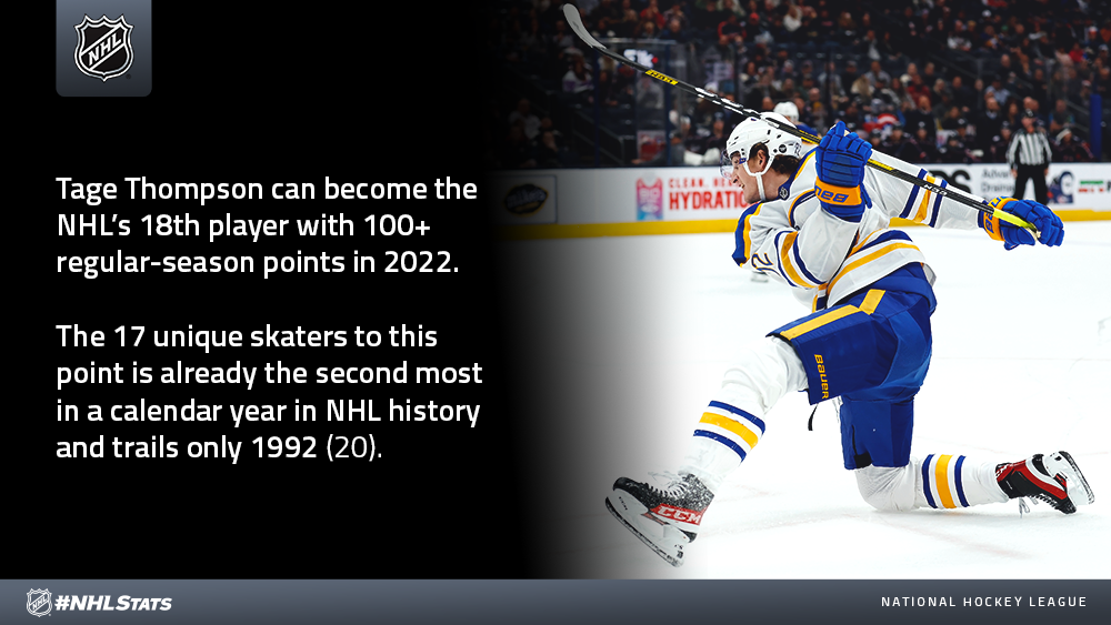* Thompson has collected 5-4—9 in his past five games and has registered 98 regular-season points in 2022 to go along with his 52 goals through that span (52-46—98 in 79 GP). He can become the sixth different Sabres player to record 100-plus points in a single calendar year and first since Alexander Mogilny in 1993 (59-50—109 in 75 GP).
