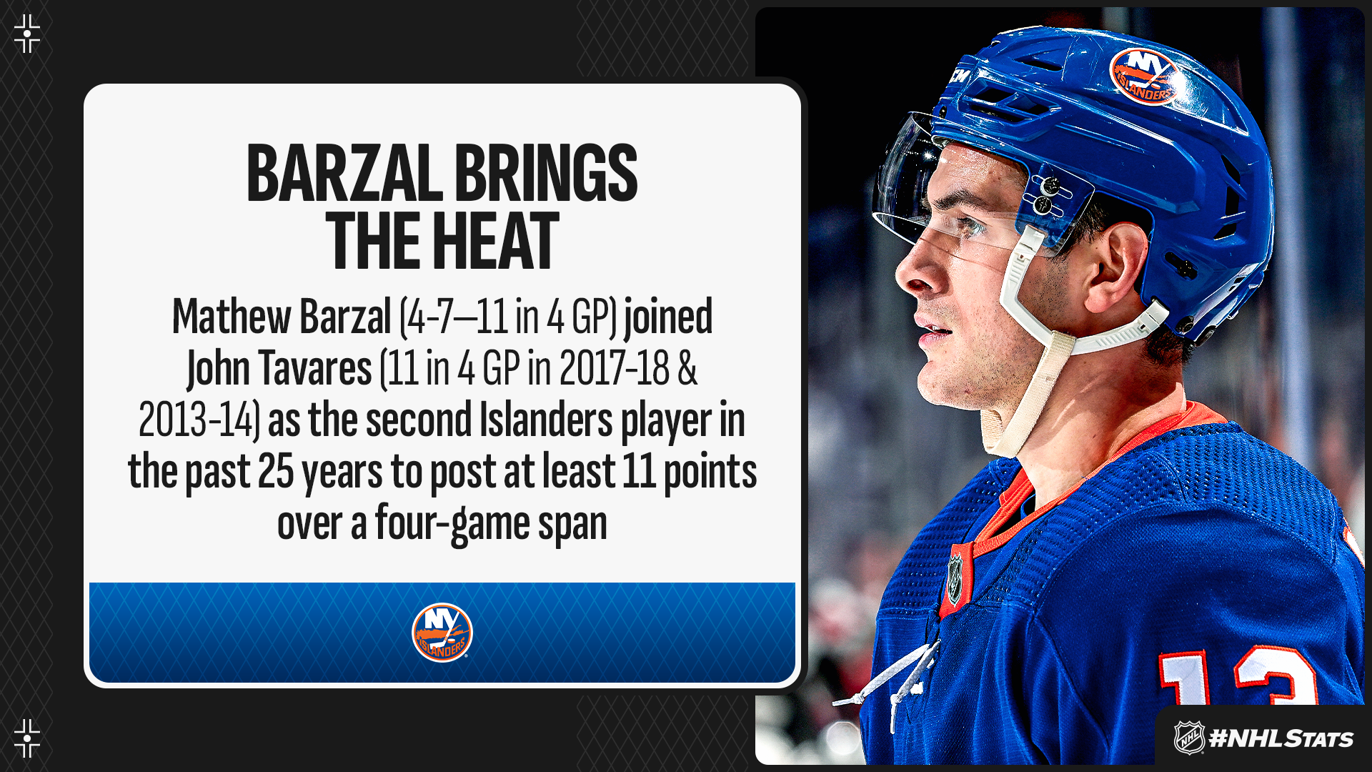 * Mathew Barzal (2-2—4) posted his second four-point outing in his past three games while Bo Horvat (2-1—3) scored two goals in 20 seconds to help the Islanders put up a season-high seven markers. Horvat’s tallies marked the fastest two goals by an Islanders skater in more than 20 years after Alexei Yashin scored two in 12 seconds on March 25, 2003.