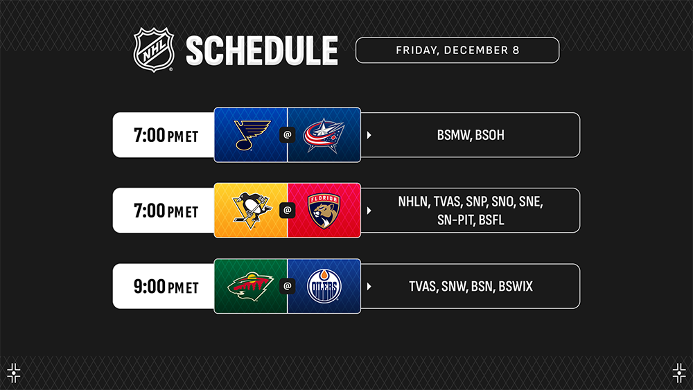 Two clubs amid timely turnarounds will clash to close a three-game Friday as Kirill Kaprizov (8-15—23 in 24 GP) and the Wild visit a streaking Oilers team captained by Connor McDavid (8-24—32 in 21 GP), who has climbed into a tie for 10th in the NHL scoring race after collecting 4-15—19 during an active seven-game point streak. That contest closes a doubleheader on TVA Sports, which begins in Florida when the Penguins meet the Panthers (available nationally in the U.S. on NHL Network).