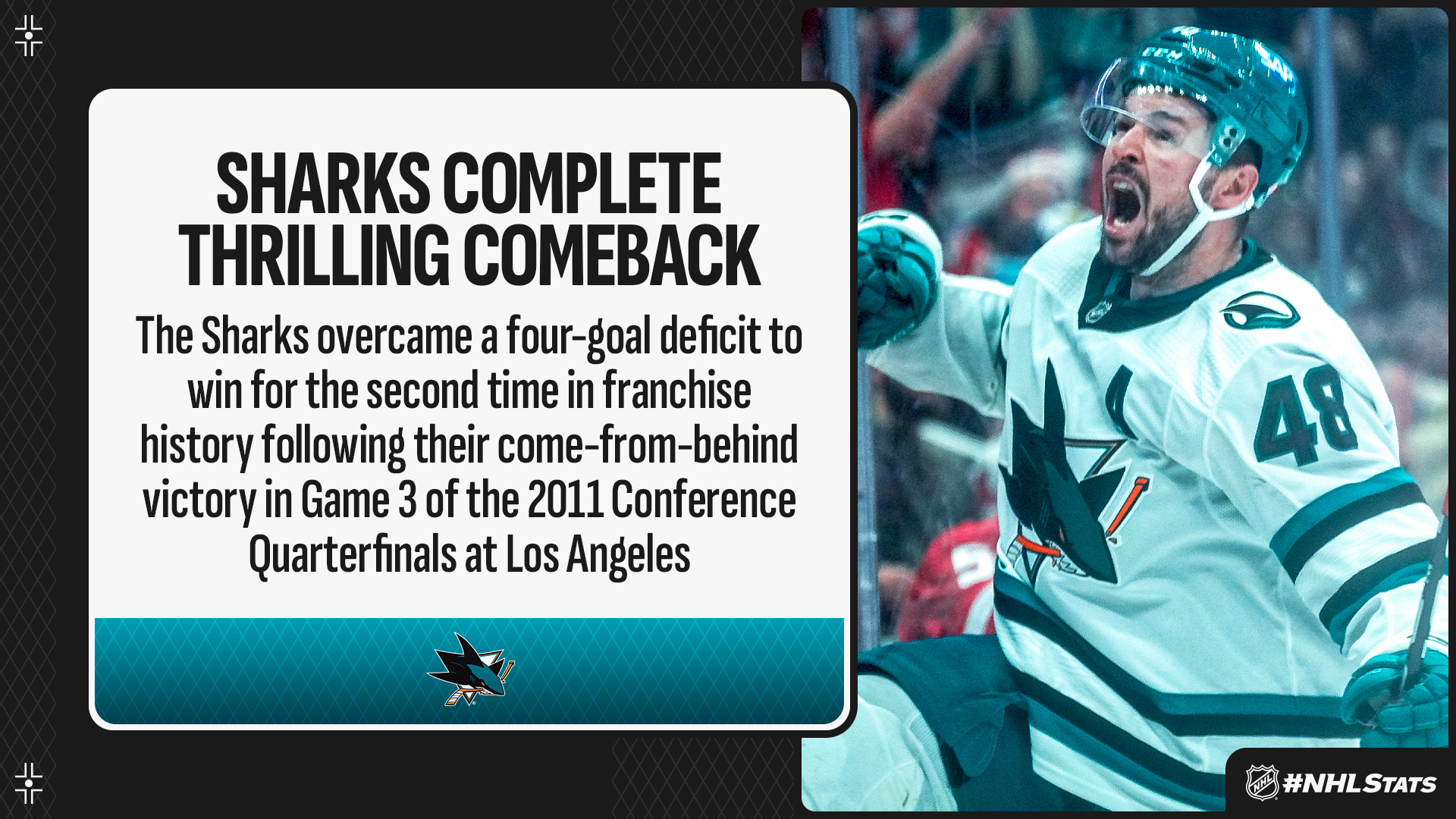 * A four-goal deficit couldn’t sink the Sharks as they went on to tally four times in a span of 5:28 before completing the first four-goal comeback victory by any team this season.