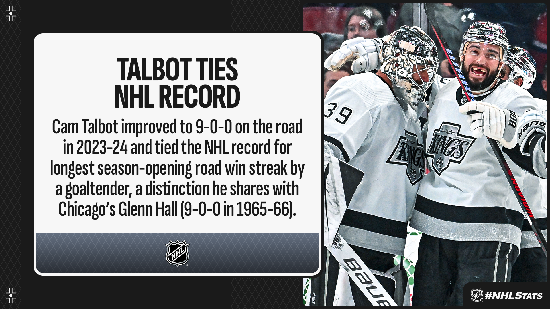 Anze Kopitar (0-3—3), Trevor Moore (1-0—1) and Cam Talbot (24 saves) all continued their road success to help the Kings blank the Canadiens and set an NHL record for longest season-opening road winning streak as they improved to 11-0-0 as visitors, besting the 2006-07 Sabres (10-0-0).