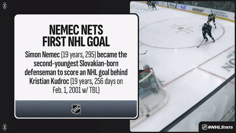 * Simon Nemec scored his first NHL goal, one that stood as the game winner, to help the Devils remain perfect in the second contest of a four-game Western Conference swing. Nemec (19 years, 295 days) became the seventh-youngest defenseman in Devils/Rockies/Scouts history at the time of his first NHL goal on a list that includes teammate Luke Hughes (6th; 19 years, 216 days).