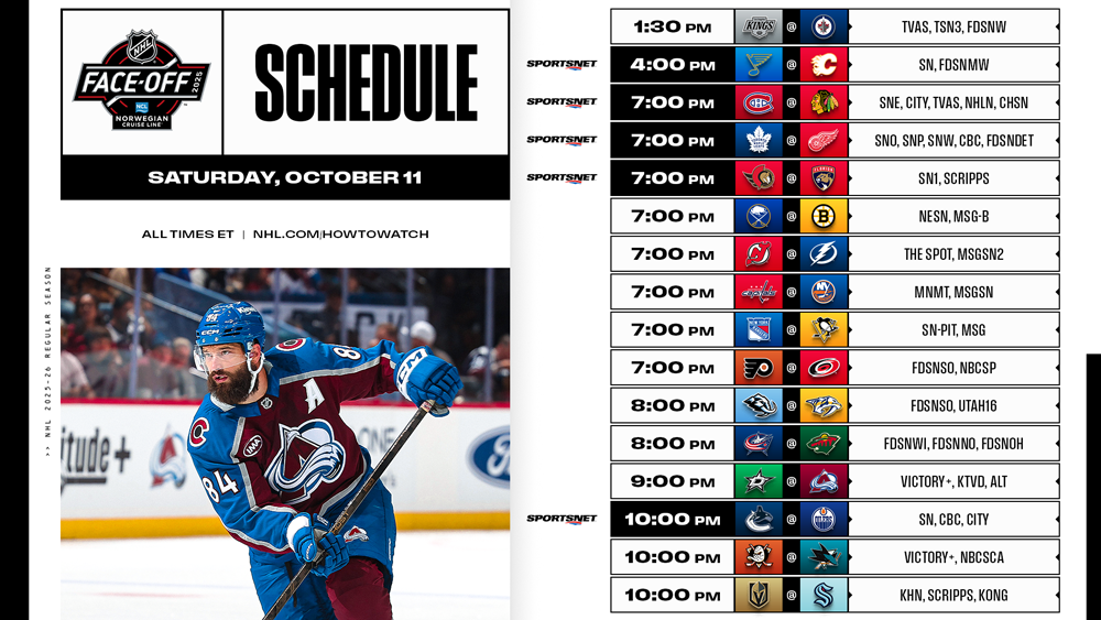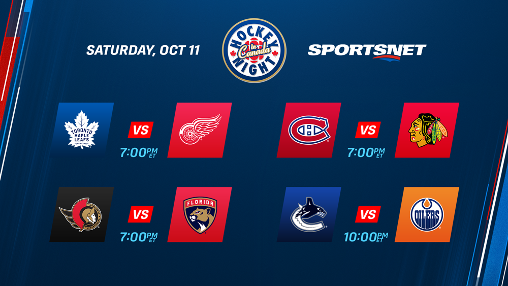 * Sportsnet’s first Hockey Night in Canada telecast of the 2025-26 regular season features two head-to-head Original Six showdowns – including a Centennial year home opener – as well as both the reigning Stanley Cup champion and finalist. The action begins at 7 p.m. ET on Sportsnet.