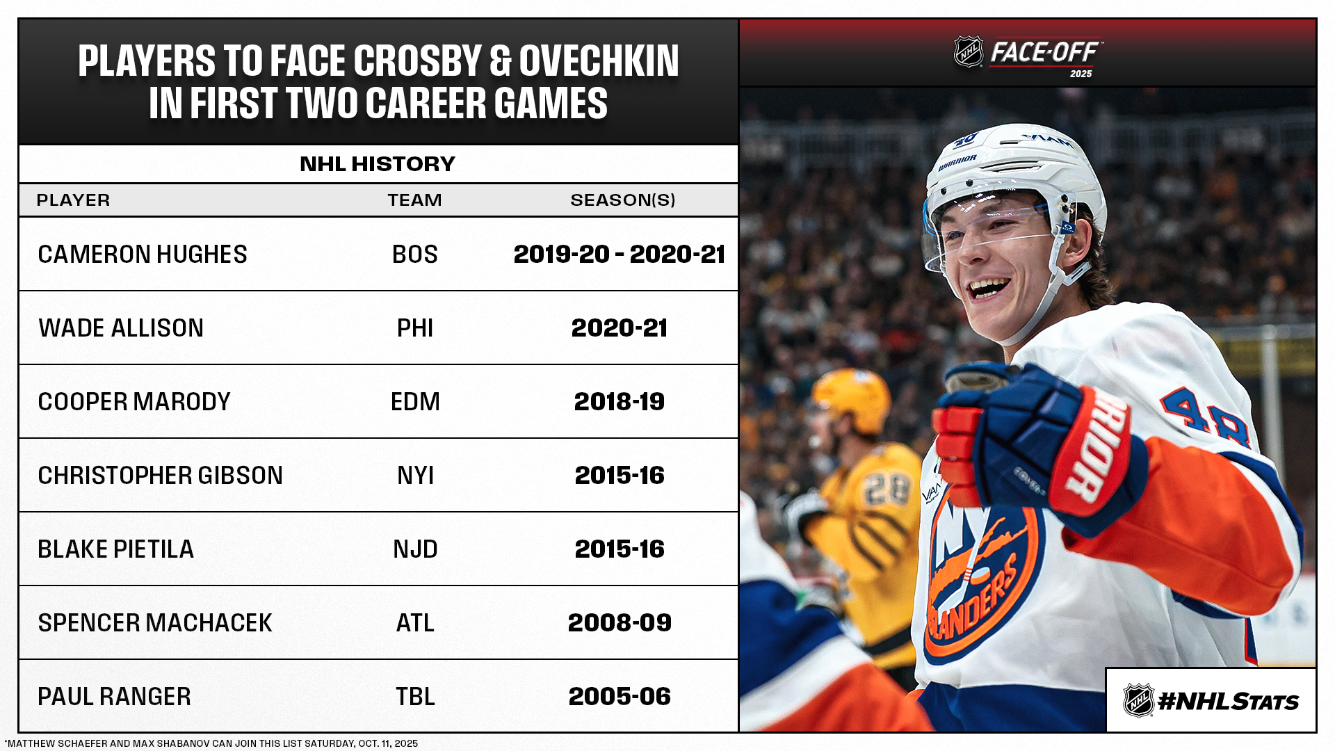 * Matthew Schaefer recorded an assist in his NHL debut against fellow No. 1 overall pick, Sidney Crosby, and will now face another first overall selection in Alex Ovechkin during his second career game. Ovechkin, who is three shy of the 900-goal milestone, is 22 years older than 18-year-old Schaefer, which will tie the largest age gap between two dueling first-overall-pick skaters (also Joe Thornton vs. Jack Hughes, Thornton vs. Alexis Lafrenière & Mike Modano vs. Taylor Hall).