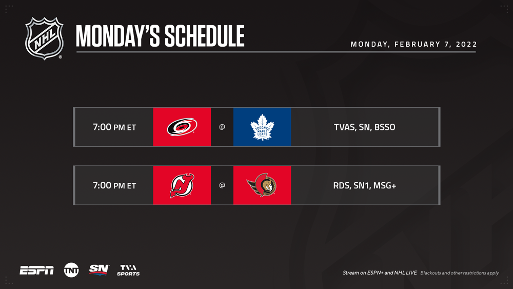 The NHL returns from 2022 Honda NHL All-Star Weekend on Monday with a pair of games in Ontario, Canada including the Hurricanes visiting the Maple Leafs in a contest that will see Mitch Marner look to extend his career-high goal streak to eight games – which would be the longest by any player in 2021-22.