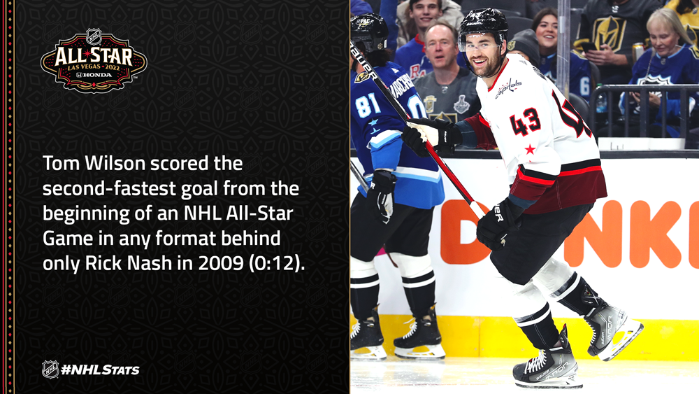 Tom Wilson scored 13 seconds into his first NHL All-Star Game, the fastest goal to start a game under the 3-on-3 format (besting the previous mark of 15 seconds set by Sidney Crosby in the 2019 semifinal). Wilson was one of 11 first-time All-Stars to score Saturday, the most ever in one year – the previous high was 10, seen in 2020 and 2017.