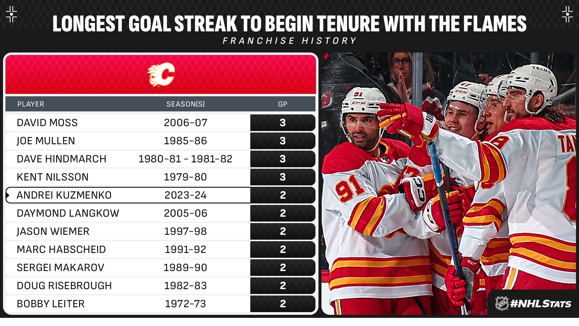 * Kuzmenko has scored in each of his first two games with the Flames and is no stranger to making an early impression with an NHL team, after also scoring in his League debut with the Canucks on Oct. 12, 2022.