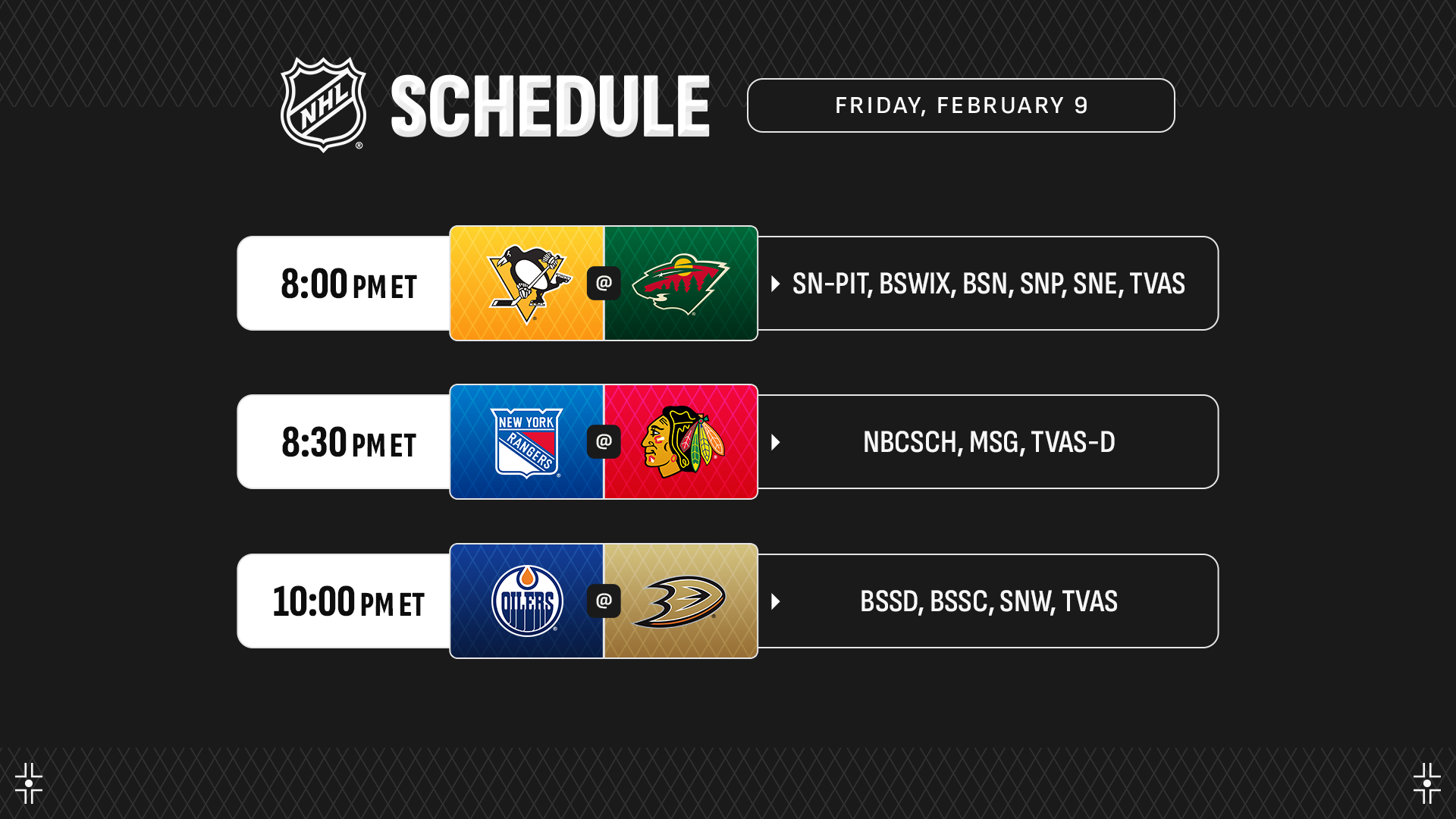 Friday will feature a doubleheader on TVA Sports in Canada, starting with the Penguins (23-17-7, 53 points) visiting the Wild (22-23-5, 49 points). Pittsburgh aims to extend its point streak against Minnesota to 11 games (9-0-1 dating to Jan. 25, 2018), a streak that is currently tied for the club’s longest active run against a single franchise. The Ducks (18-30-2, 38 points) then welcome the Oilers (29-16-1, 59 points), with Edmonton looking to bounce back from its first loss of 2024 – Edmonton’s 11 wins since Jan. 1 are tied with Vancouver for the most among all teams.