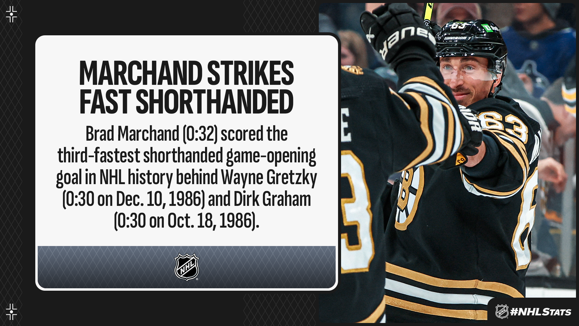 * The top two teams in the NHL battled it out Thursday, but the Bruins defeated the Canucks with the help of fast goals to start the first and second period, including Brad Marchand’s tally just 32 seconds into the game – tied for the third-fastest shorthanded goal to start a contest in NHL history.