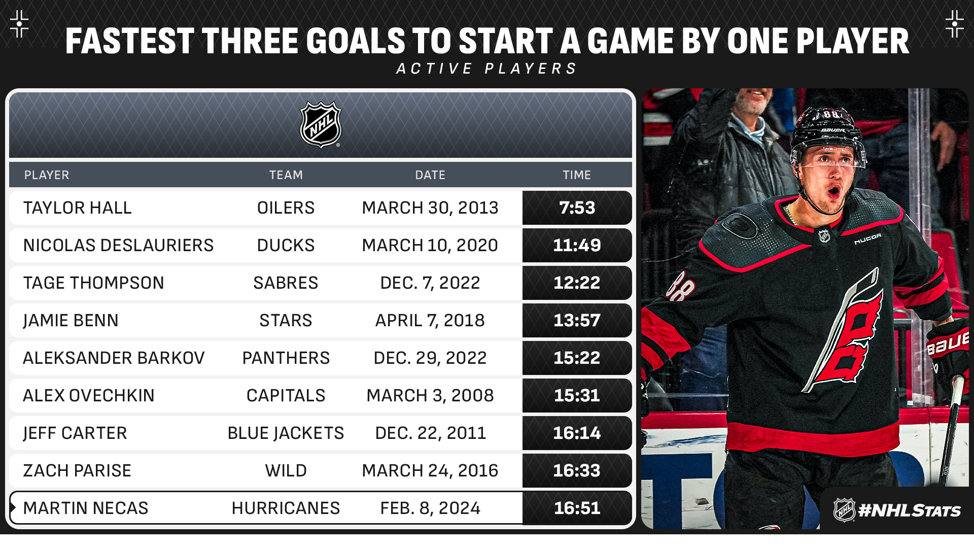 * Martin Necas scored three goals in the opening 16:51 and joined Cory Stillman (3 in 11:28 on Nov. 5, 2007) as the second player in Hurricanes/Whalers history to net a first-period natural hat trick as Carolina staved off a Colorado comeback attempt that included a franchise-record two goals in five seconds. Necas joined Teuvo Teravainen (3-0—3 on Oct. 27) as the second player to score a natural hat trick with Carolina this season – eight of the 11 natural hat tricks in 2023-24 have now been produced by just four teams (CAR, EDM, CBJ & VAN all w/ 2).