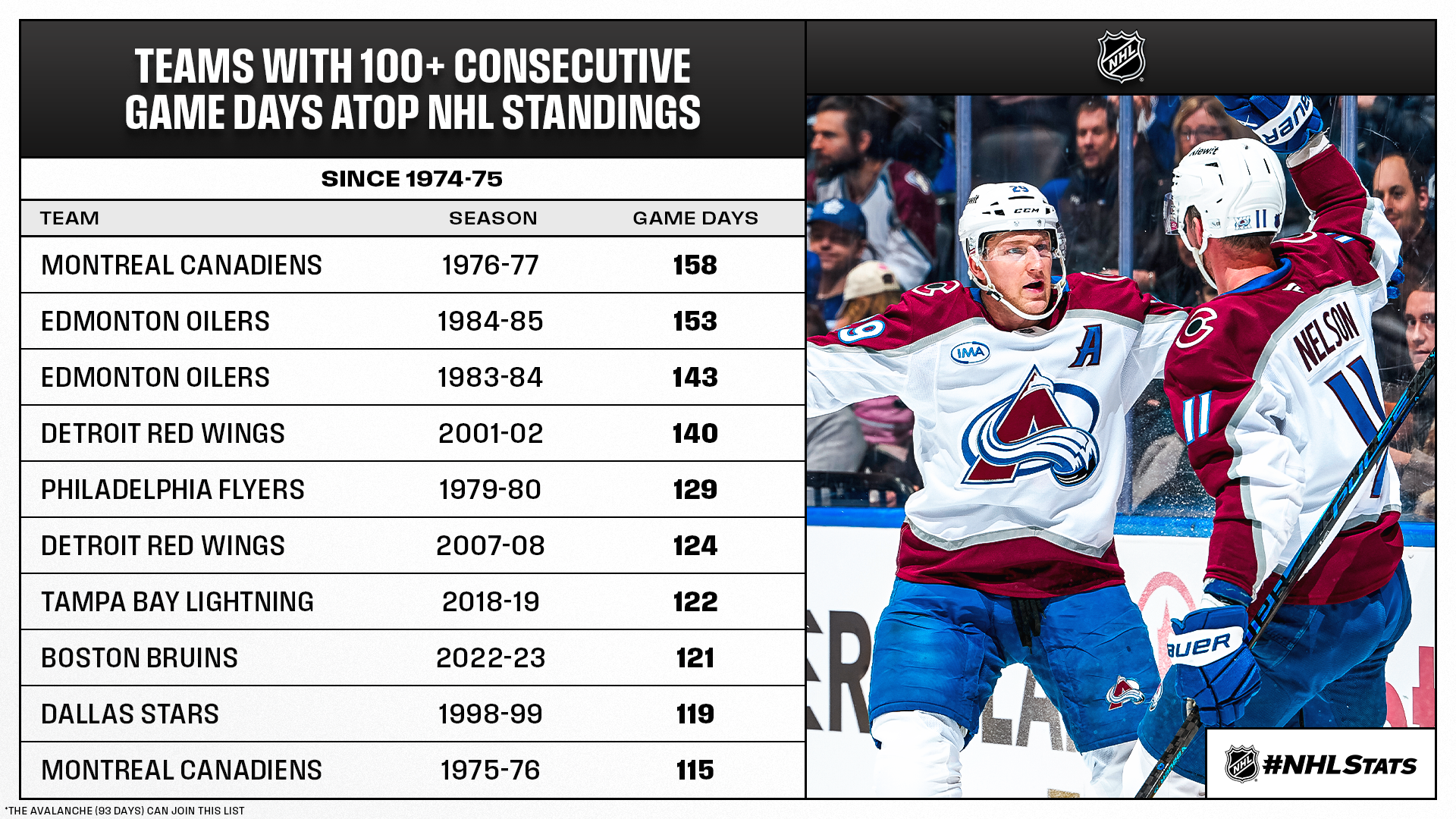 * Colorado, which had four players competing in the gold medal game on Sunday including Brock Nelson who added to his family’s Olympic lore, has occupied first place in the League standings for 93 consecutive game days since Nov. 1. The Avalanche can become the first Western Conference club to hold top spot in the NHL for at least 100 straight game days since the 2007-08 Red Wings (124 days).