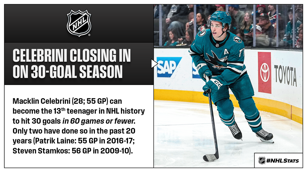 * Olympic All-Star Macklin Celebrini had a tournament to remember, topping all players in goals (5; tied for the most by a Canadian at Olympics with NHL players) and setting a new mark for most points by teenager in an Olympic tournament with NHL participation (10). He returns to the Sharks within two goals of his first 30-goal season (28-53—81 in 55 GP). The 19-year-old, who has four multi-goal NHL games in 2025-26, can become just the third teenager to record a 30-goal campaign in the past 14 years, following Patrik Laine (44 in 2017-18 & 36 in 2016-17) and Auston Matthews (36 in 2016-17).