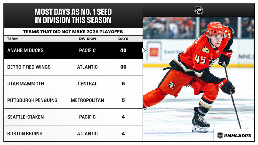 * Anaheim’s 40 game days atop its division are the most this season by a team that did not qualify for the postseason in 2024-25. The Ducks last made the playoffs in 2017-18 and are looking to end the League’s fourth-longest active postseason drought with the continued success of their youth, including rookie standout Beckett Sennecke (18-26—44). The forward can become the fifth Ducks rookie to score 20 goals in a season and needs 18 points in Anaheim’s final 26 games to pass Trevor Zegras (61 in 2021-22) for the franchise’s single-season rookie scoring record.