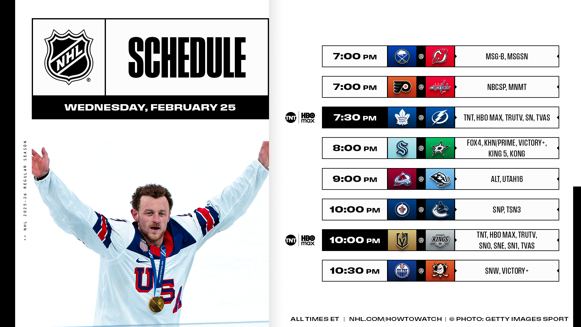 * Vegas will welcome home five players from the Olympic gold medal game – including Americans Jack Eichel and Noah Hanifin – as it looks to build on its lead in the Pacific Division, where only five points separate first and fourth place.