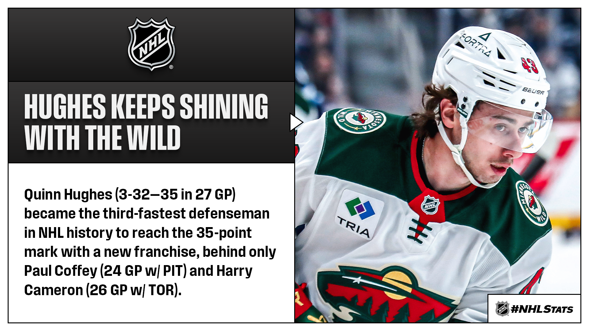 Matt Boldy (2-2—4) factored on four of Minnesota’s five goals and Quinn Hughes (0-1—1) extended his point/assist streaks to 11 games as the Wild (35-14-10, 80 points) defeated the League-leading Avalanche (38-10-9, 85 points) and leapfrogged the idle Stars (35-14-9, 79 points) for second place in the Central Division. Minnesota, with an active six-game win streak and eight-game point streak, was averaging 2.81 goals per game (25th) before Hughes arrived to the ‘State of Hockey’ but the 2023-24 Norris Trophy winner has since helped the team produce an an NHL-leading (tied) 3.96 goals per game during his tenure.