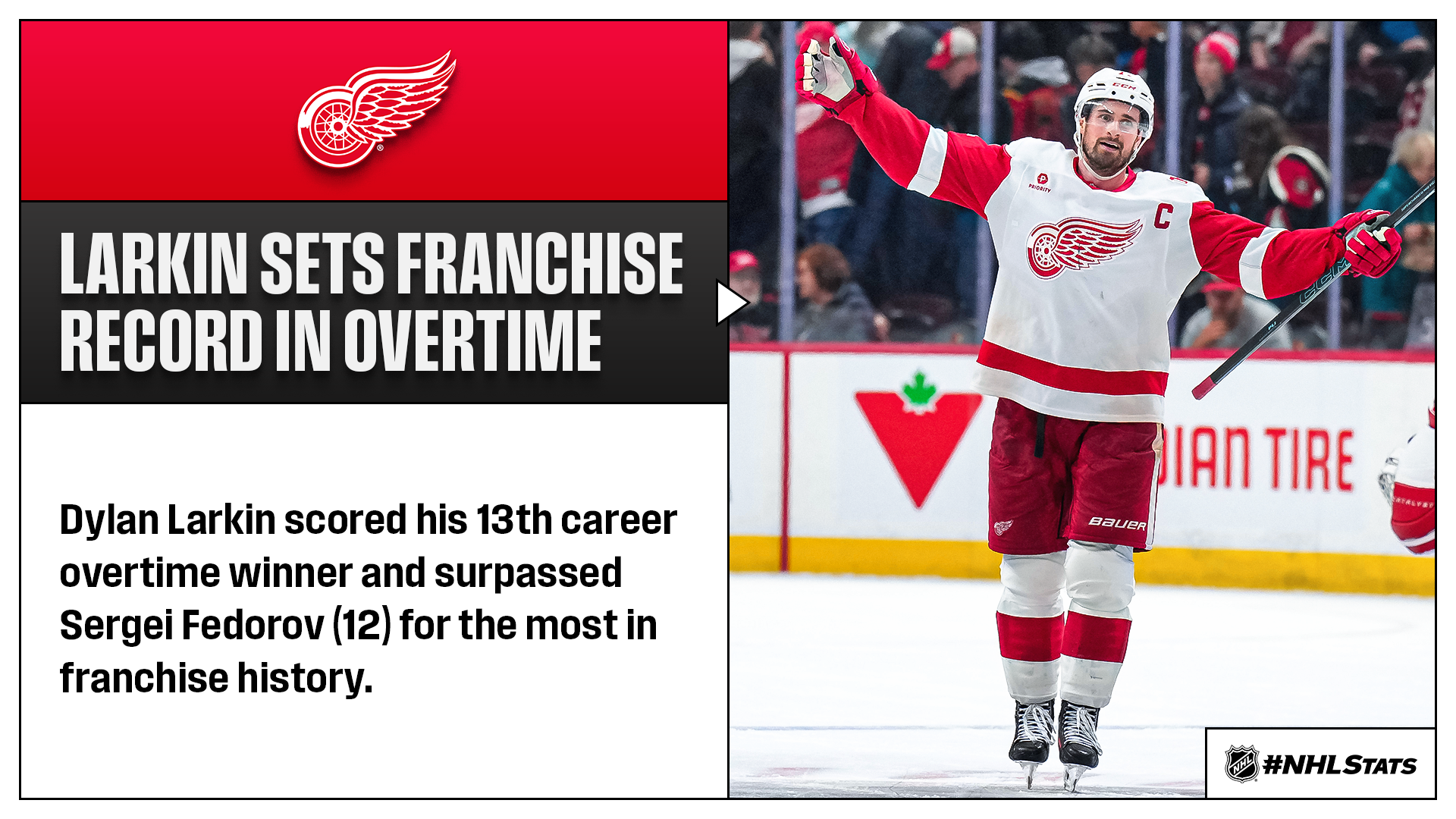 * Senators captain Brady Tkachuk (1-0—1) put his team up 1-0 but Red Wings captain Dylan Larkin (2-0—2) scored to pull his team even in the second period and then set a franchise record with his overtime goal as the Red Wings earned their ninth overtime victory of the season – tied with the Canadiens, Sharks and Wild for the most among all teams. In the process, Detroit (34-19-6, 74 points) leapfrogged the Canadiens (32-17-9, 73 points) and idle Sabres (33-19-6, 72 points) for second place in the Atlantic Division.