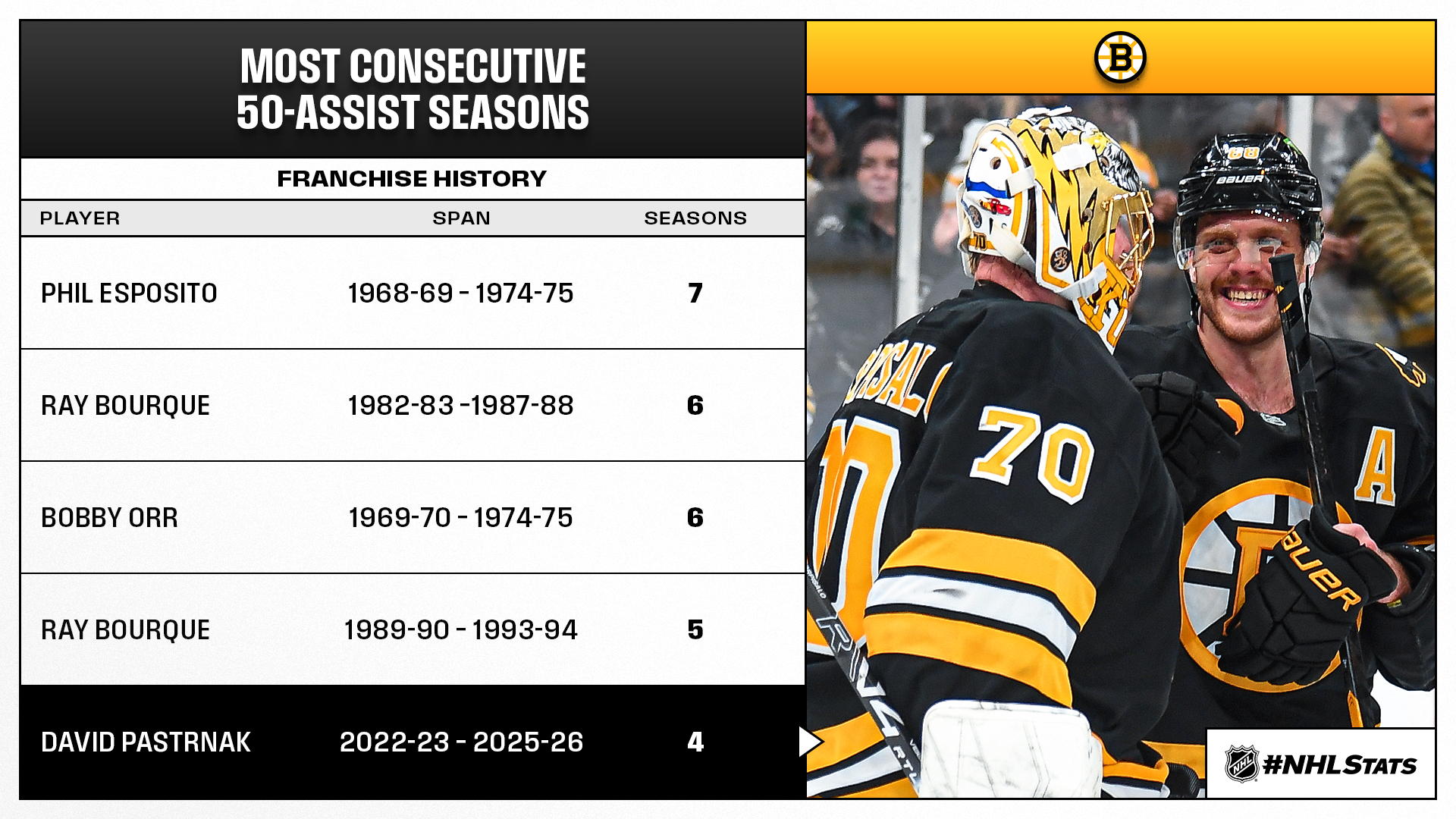 * The Blue Jackets brought their seven-game win streak to TD Garden with the hopes of narrowing the gap in the Eastern Conference Wild Card race but David Pastrnak (0-1—1) factored on one of four Bruins goals to reach the 50-assist mark for the fourth straight season and help the hosts extend their home win streak to 10 games – one of Boston’s seven streaks of double-digit length since 1975-76.