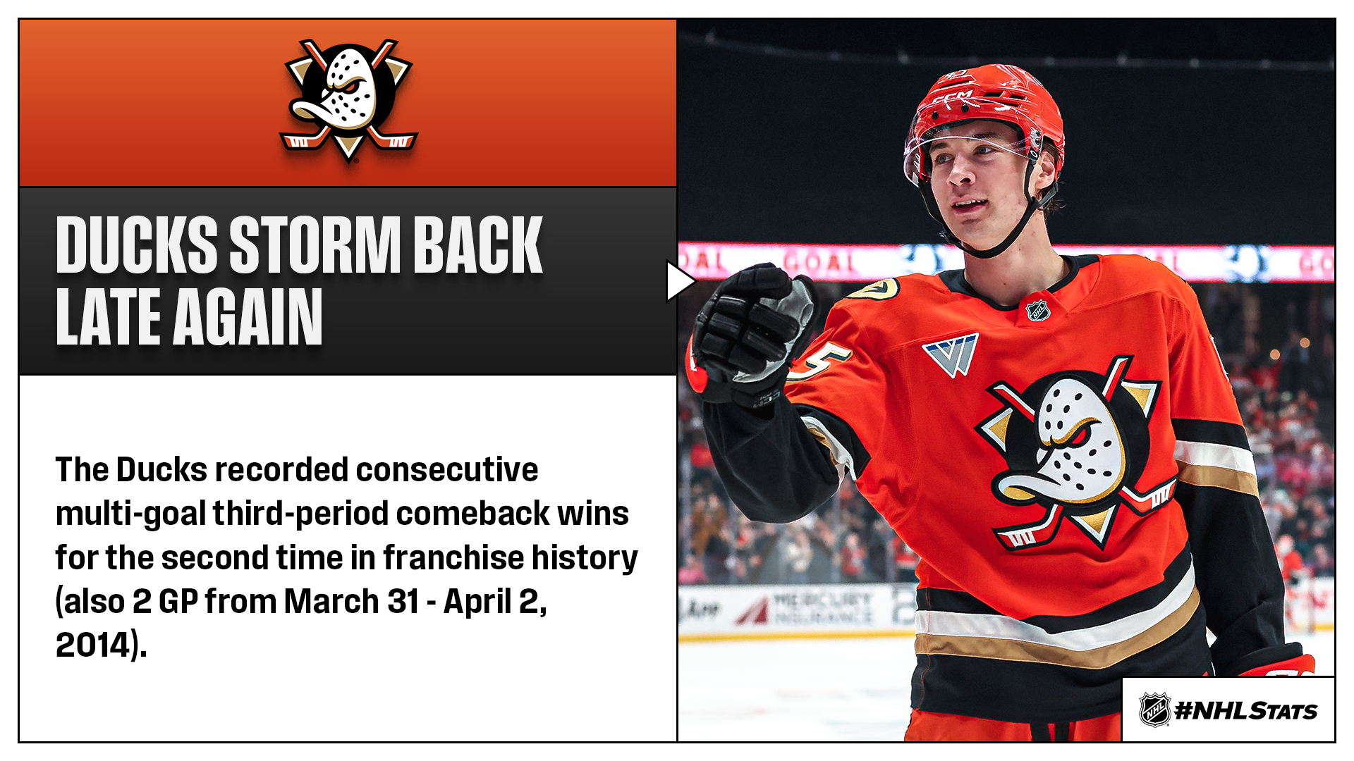 * The Ducksstormed back from a two-goal third-period deficit for the second straight game and matched a franchise mark with their League-leading ninth multi-goal comeback win of the season.