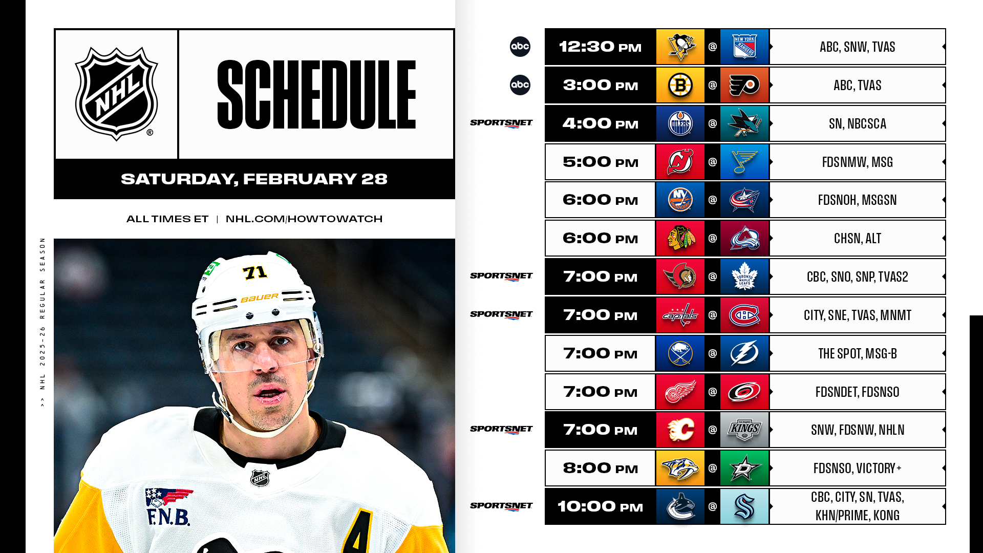A 13-game Saturday will feature 12 hours of consecutive NHL action, including a doubleheader on ABC starting with the Penguins visiting the Rangers before the Flyers welcome the Bruins. It will also feature four Hockey Night in Canada matchups, comprised of showdowns between the Capitals-Canadiens, Senators-Maple Leafs, Flames-Kings and Canucks-Kraken.