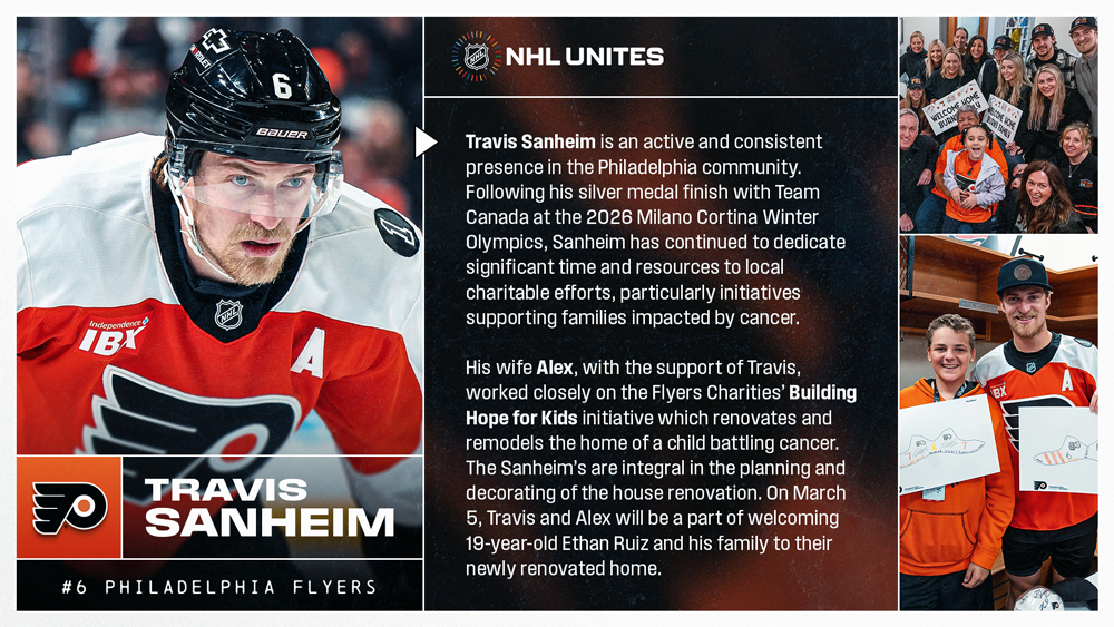 * Sanheim, returning from representing his country at the Olympic Winter Games Milano Cortina 2026, is being featured for his community impact. Sanheim has been actively involved in Philadelphia for nearly a decade now and in his hometown of Elkhorn, Man. Sanheim and Kraken assistant coach Jessica Campbell support their hometown by attending charity events and donating to their local rink. His involvement has also included an equipment donation program for the Elkhorn Manitoba Minor Hockey association.