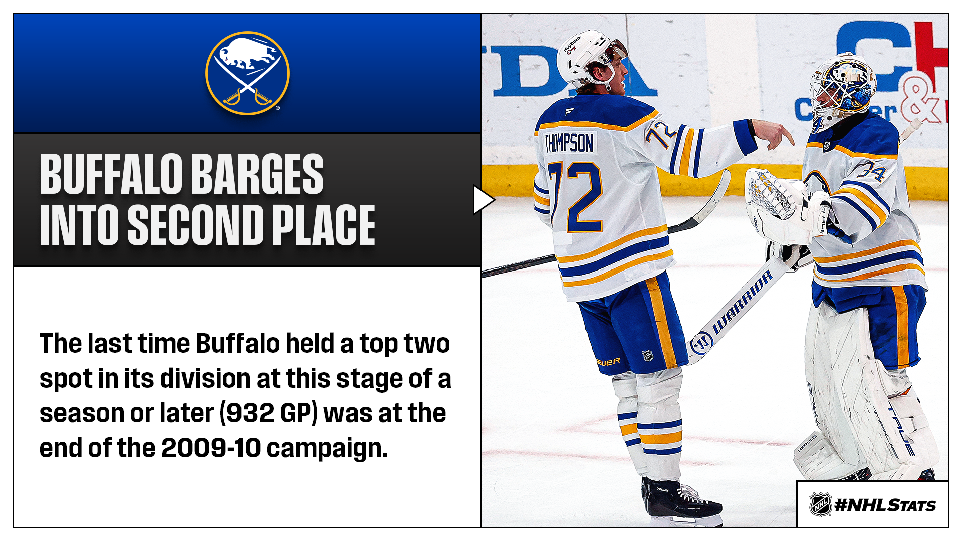 * The Sabres and Capitals earned crucial wins to strengthen their respective positions in the Eastern Conference playoff race, with Buffalo moving into second place in its division at this stage of a season or later (932 GP) for the first time since 2009-10.