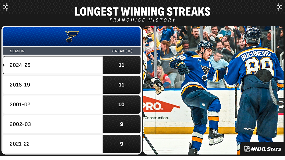 The Blues (42-28-7, 91 points) and Stars (50-21-4, 104 points) both rallied from one-goal deficits to extend their lengthy winning streaks to 11 and seven games, respectively. St. Louis surpassed the idle Wild (41-28-7, 89 points) for sole possession of WC1 in the Western Conference, while the Stars kept pace with the Jets (52-20-4, 108 points) who matched a single-season franchise record for wins Thursday.