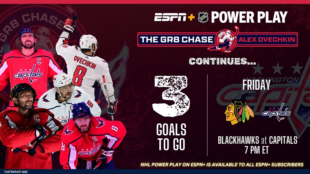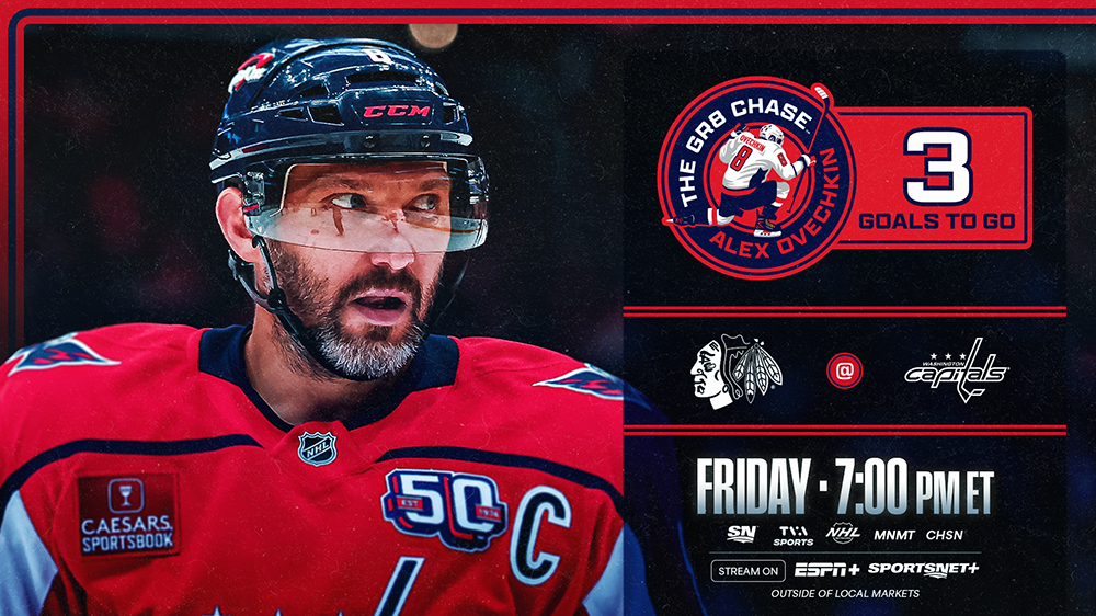 * Alex Ovechkin enters Friday’s three-game slate just a hat trick away from completing The Gr8 Chase when his Capitals face the Blackhawks on Sportsnet, TVA Sports, NHL Network and on ESPN+ (out of market).
