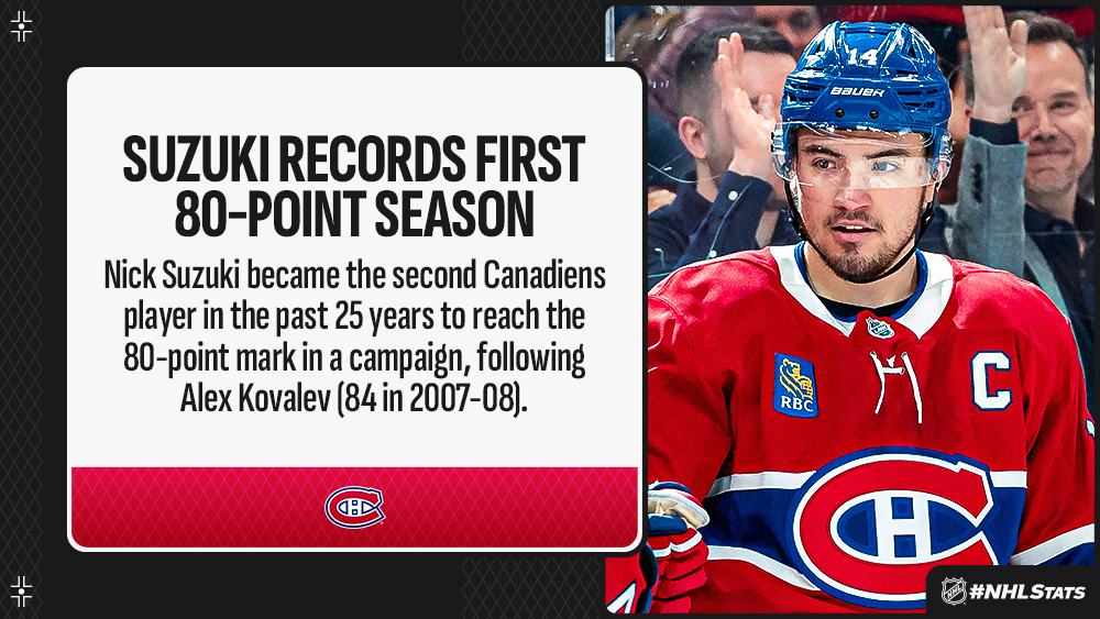 * Suzuki hit and eclipsed the 80-point mark for the first time in his career with his 23rd multi-point game of the season, which passed Vincent Damphousse (22 in 1996-97) for the fourth most in a season by a Canadiens player in the past 30 years. The victory helped Montreal create a two-point cushion on the idle NY Rangers (36-32-7, 79 points) for WC2.