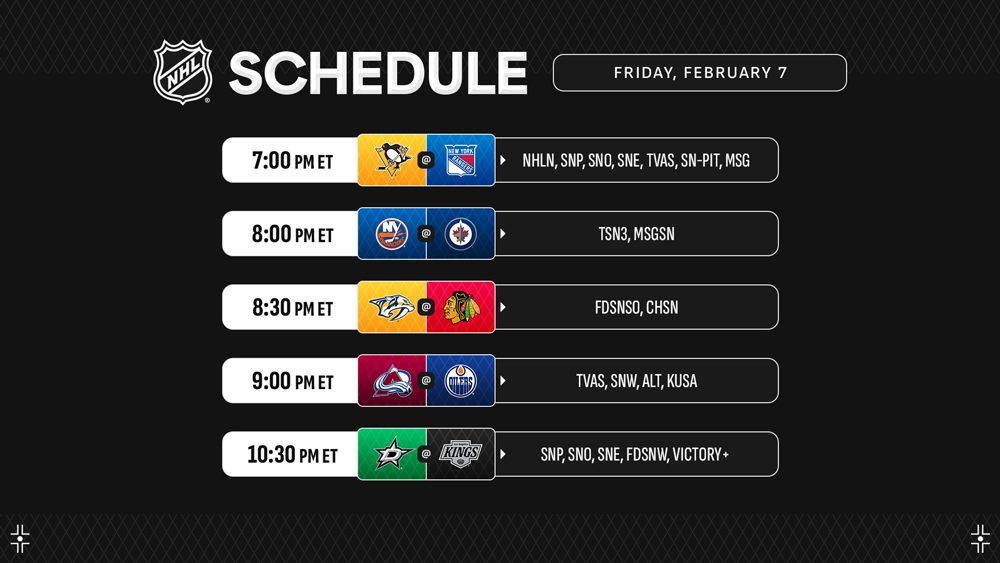 Ten teams are in action on Friday, including Edmonton, Colorado and Winnipeg who will contest their final game before selected players head to Montreal for the 4 Nations Face-Off (Feb. 12-20), with Nathan MacKinnon and Connor McDavid going head-to-head prior to joining forces on Canada’s roster next week. They enter Friday’s contest as the two players named to a 4 Nations roster with the most points so far in 2024-25.