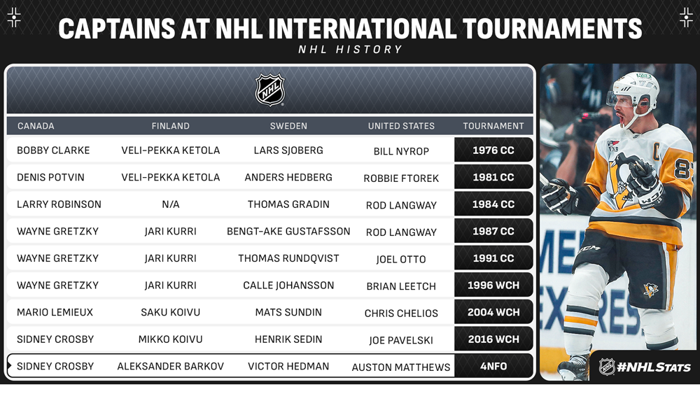 Sidney Crosby (Canada; PIT), Aleksander Barkov (Finland; FLA), Victor Hedman (Sweden; TBL) and Auston Matthews (USA; TOR) were announced as captains for the 4 Nations Face-Off, a best-on-best international tournament that will include seven games over nine days from Feb. 12-20 in Montreal and Boston. All four players wear the “C” for their NHL team and will be joined by a cast of assistant captains.