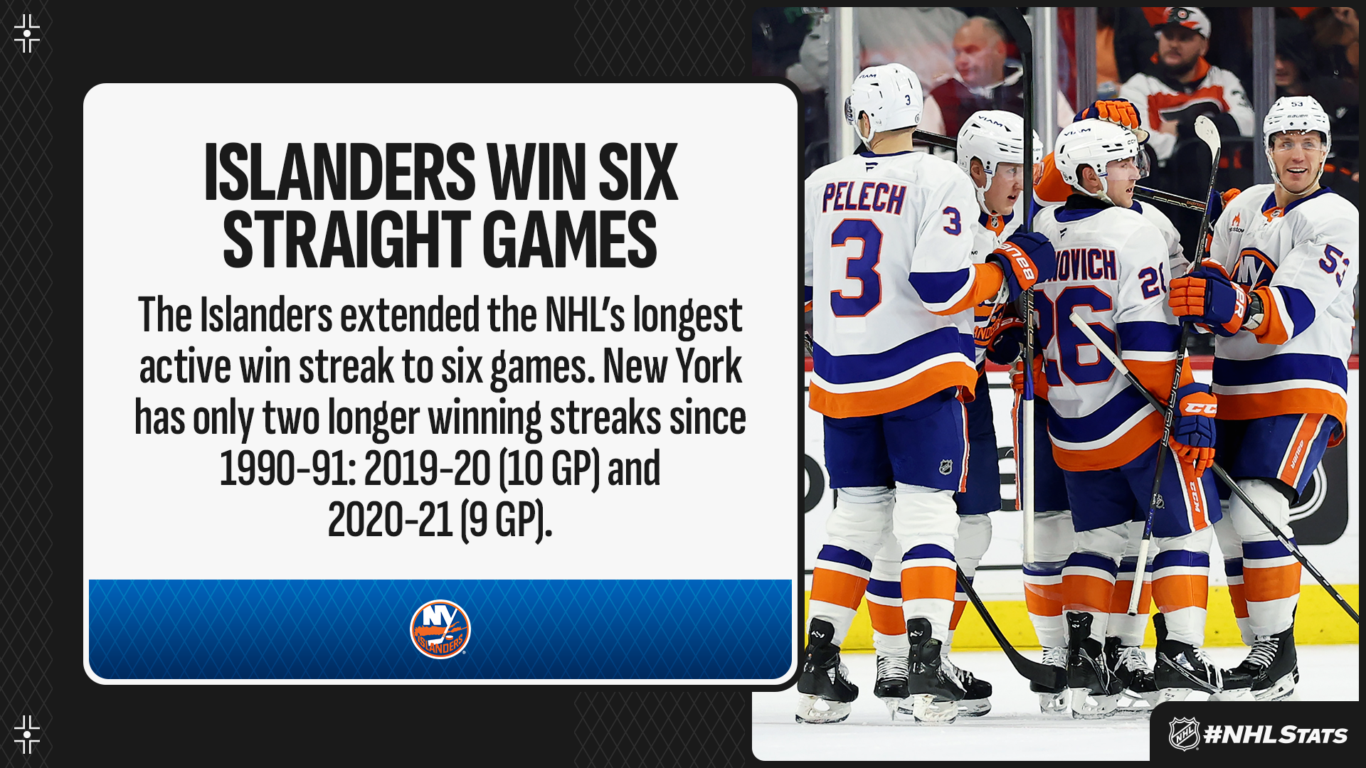 * Ilya Sorokin made 23 saves to help the Islanders shut out the Flyers and extend the League’s longest active win streak to six games as they kept pace in the East. New York became the latest team involved in the Eastern Conference’s Wild Card race this season with a win streak of six or more games, following Detroit (7 GP from Dec. 29, 2024 to Jan. 12, 2025), Ottawa (6 GP from Dec. 11-21, 2024) and Columbus (6 GP from Jan. 4-16, 2025) – all three of which also earned a win Thursday.-31015609.png)