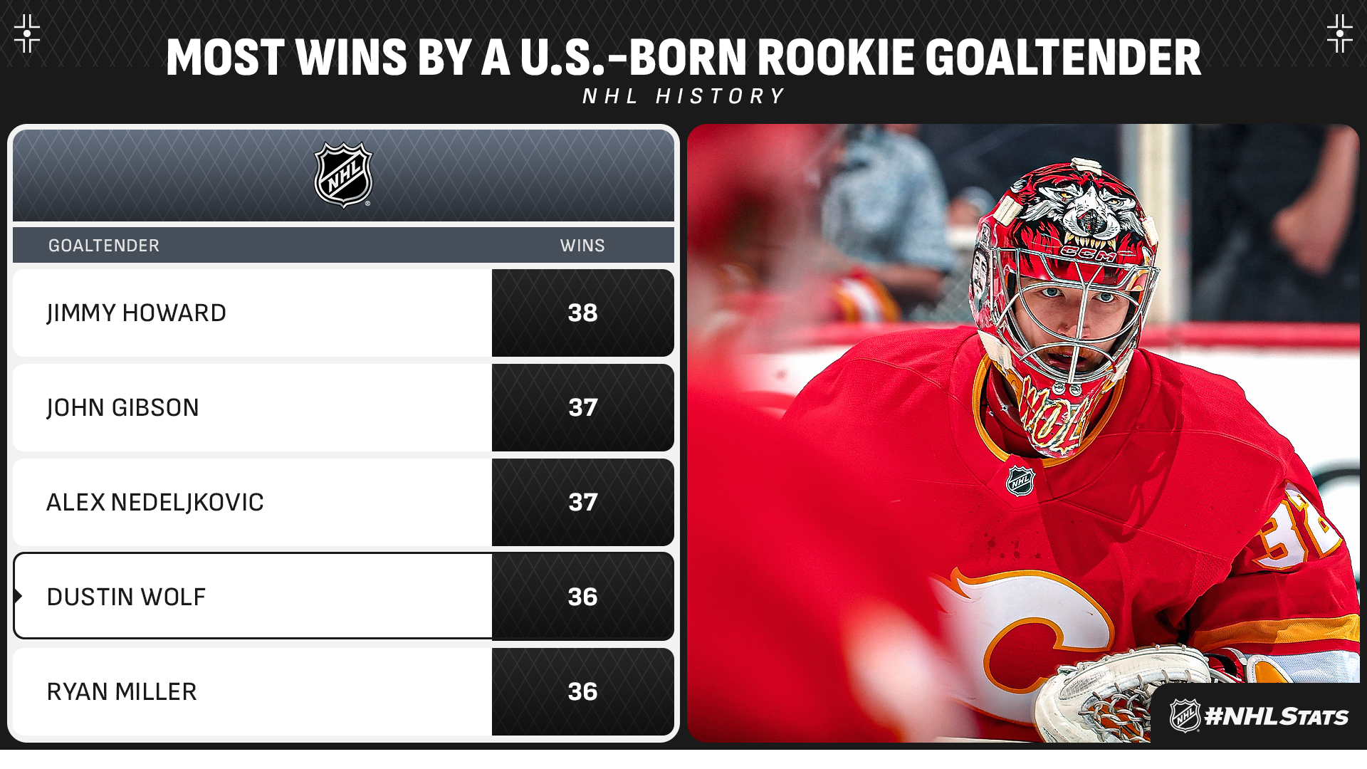* Wolf earned his 28th win of 2024-25, which tied Sergei Bobrovsky (28 in 2010-11) for the third most in a season by an active netminder in their rookie campaign. The list is topped by Matt Murray (32 in 2016-17) and Stuart Skinner (29 in 2022-23). He became just the second Flames goaltender in the past 10 years to record as many victories in a season next to Jacob Markstrom (37 in 2021-22).