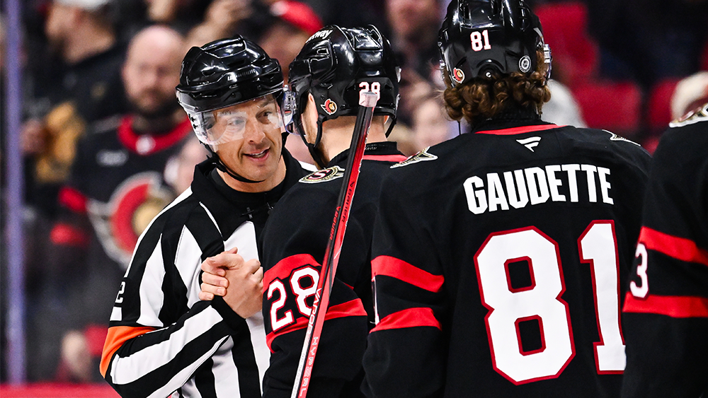 * Referee Ghislain Hebert congratulated after working his 1,005th and final NHL game