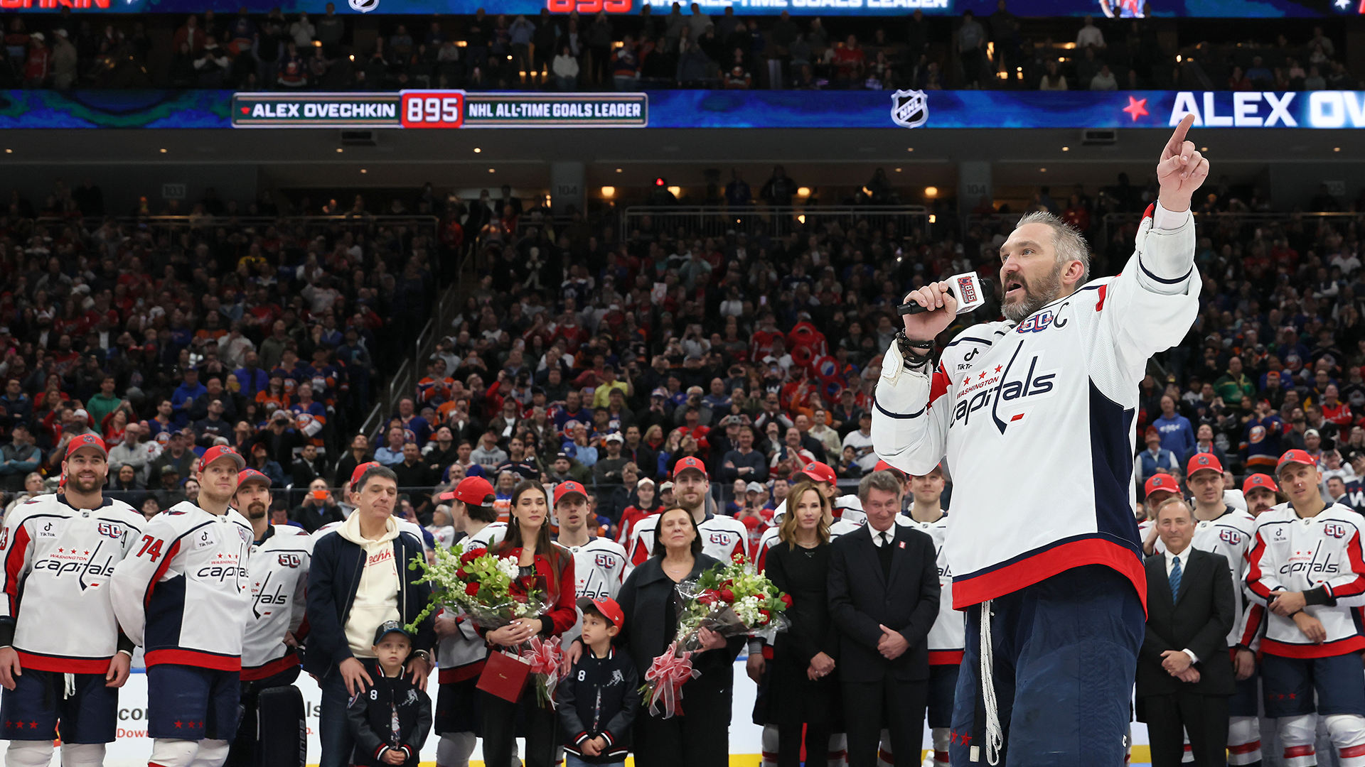 Chants of ‘Ovi, Ovi, Ovi’ echoed throughout UBS Arena as 17,255 fans experienced the moment of a lifetime and celebrated Alex Ovechkin as the greatest goal scorer in NHL history. Following a congratulatory handshake with each Islanders player, the Capitals captain was joined at center ice by his family, NHL Commissioner Gary Bettman, Wayne Gretzky and Capitals owner Ted Leonsis to commemorate his incredible accomplishment with a one-of-its-kind painting.