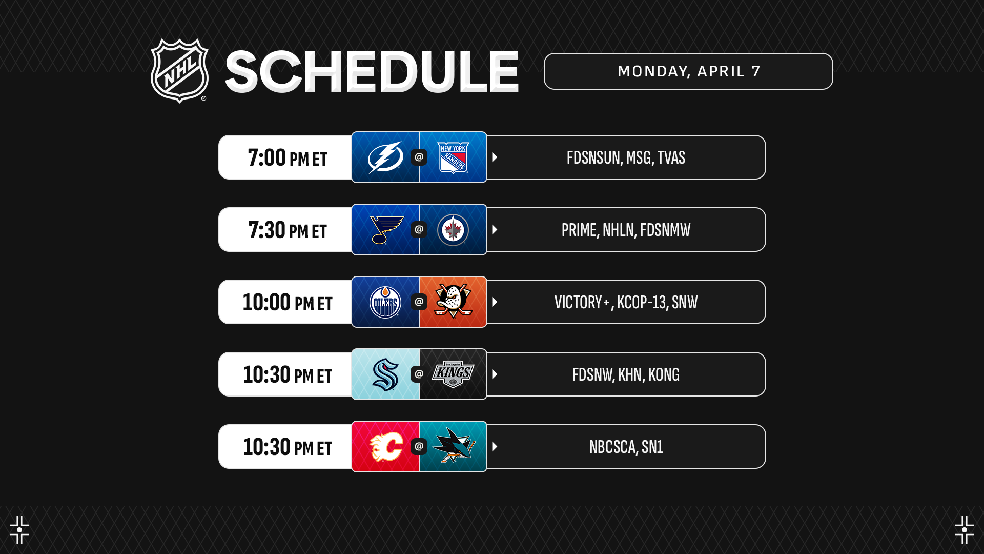 Saturday, April 12 – National Games on ABC, ESPN+, Hockey Night in Canada