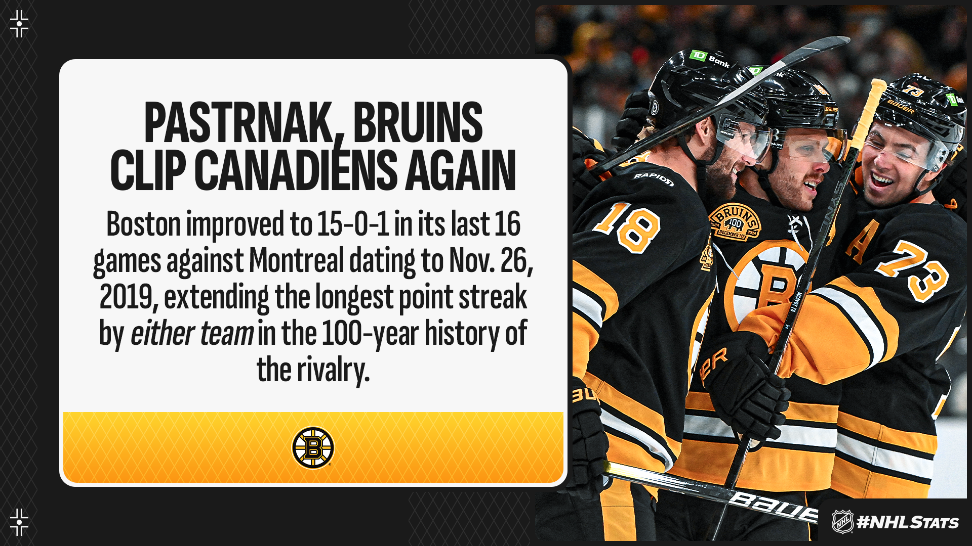 PASTRNAK POTS ONE OF BRUINS’ SIX GOALS DURING CENTENNIAL GAME VICTORY