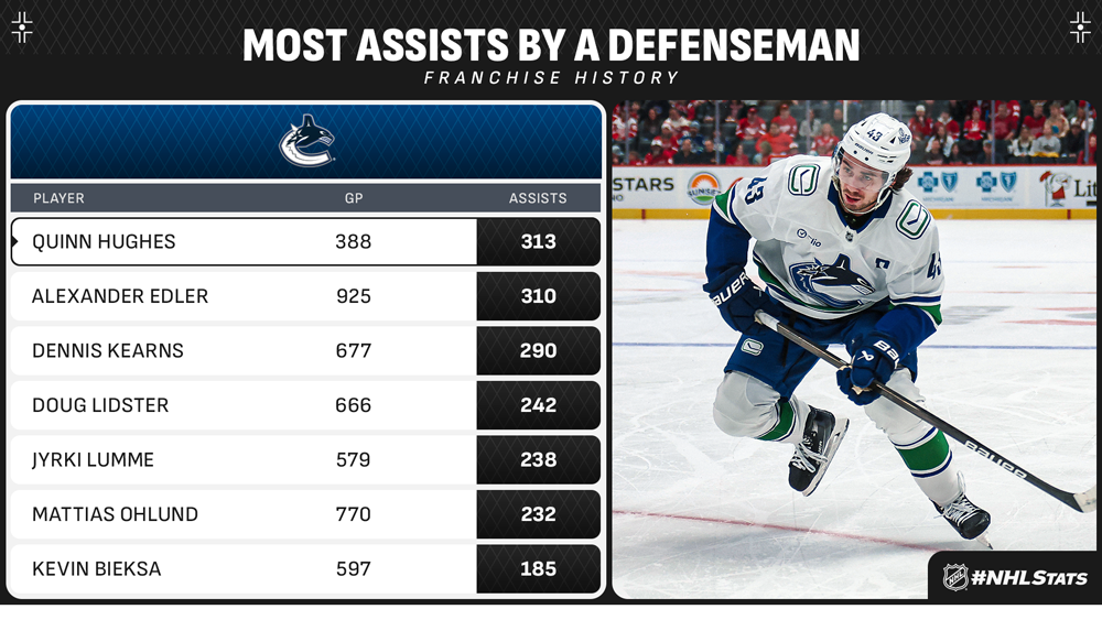* Quinn Hughes (0-3—3) recorded three assists, including a helper on the overtime winner, to surpass Alexander Edler (310) for the most assists by a defenseman in franchise history – Hughes required 537 fewer games to reach the mark. Hughes already owned Canucks franchise records for assists and points in a season by a defenseman.