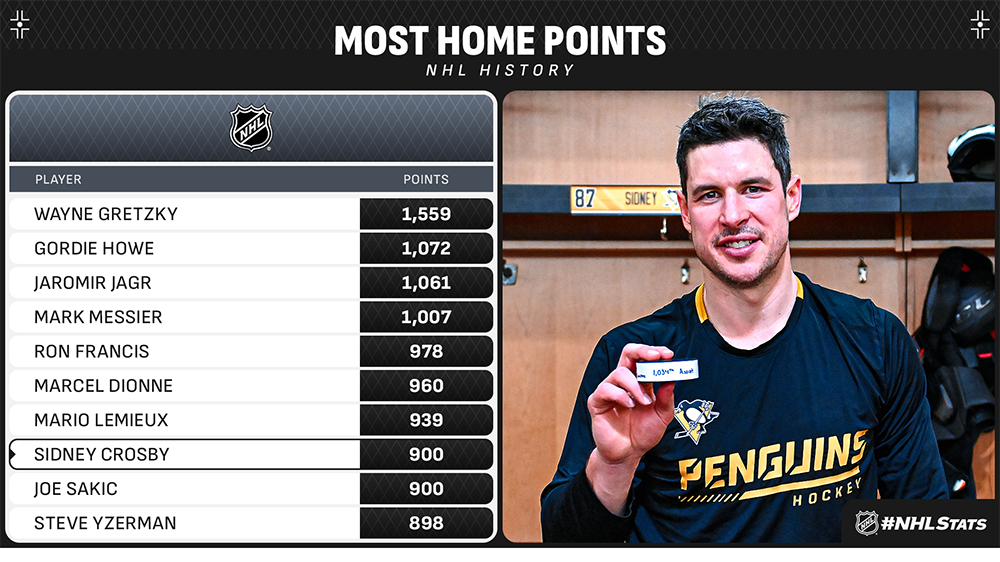 * Crosby (0-1—1) recorded his 1,034th career assist and passed Mario Lemieux (1,033) for the most in Penguins history – and fourth most in NHL history with a single franchise – before being immediately greeted with a standing ovation from the Pittsburgh faithful. Crosby’s point was the 900th at home in his career and the first against Marcus Hogberg, the 201st different goaltender he has found the score sheet against (regular season & playoffs), ranking him behind only Jaromir Jagr (232), Patrick Marleau (212), Joe Thornton (211), Mark Messier (208) and Ron Francis (204) for the most all-time.