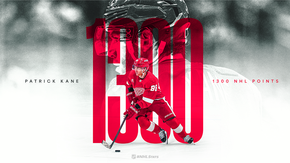 * Kane(1-1—2) factored on two of his team’s four goals to record his 1,300th career point as Detroit defeated Washington on Sunday. Kane (477-823—1,300) became the fourth active player and just the second U.S.-born player in NHL history to reach the milestone, following Mike Modano (561-813—1,374).
