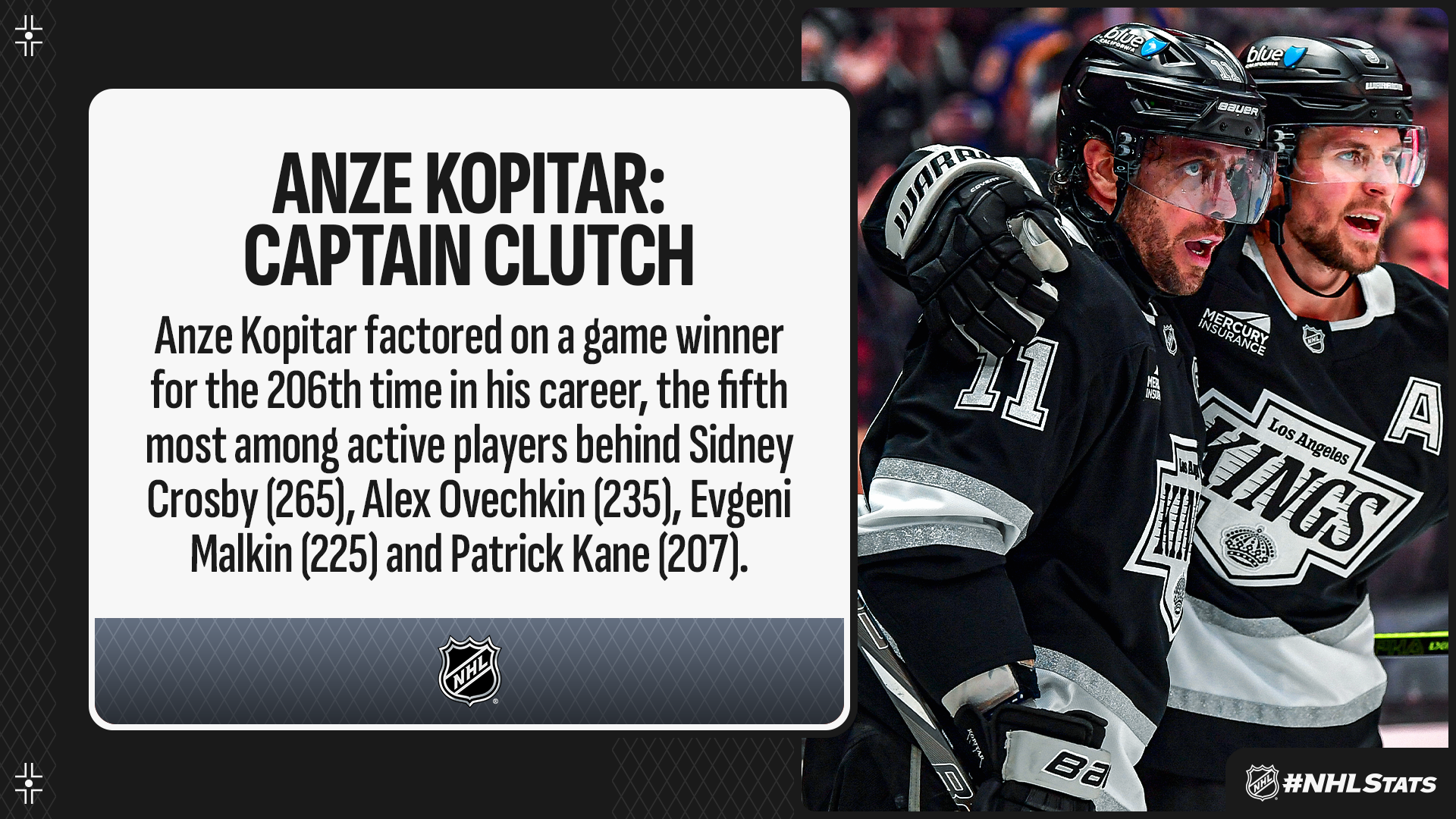 * Los Angeles (21-10-5, 47 points) found itself trailing in the third period before Anze Kopitar scored the only two tallies in the final frame to propel the Kings past the Flyers for the third-period comeback victory. Kopitar recorded his 23rd career multi-goal period and passed Dave Taylor (22) for the fourth most in franchise history, behind Luc Robitaille (39), Marcel Dionne (30) and Bernie Nicholls (29).