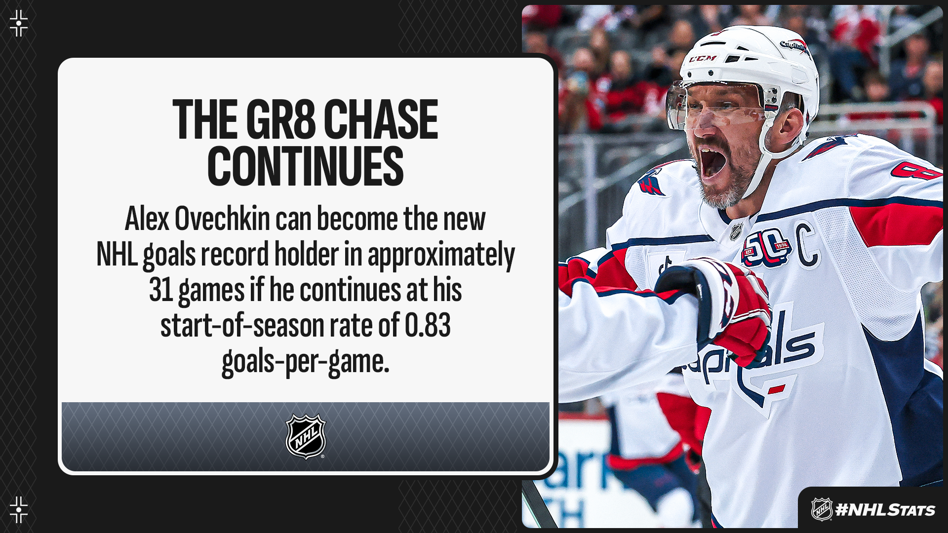 Twenty-five goals – that’s how many remain until Alex Ovechkin completes The Gr8 Chase and breaks Wayne Gretzky’s longstanding NHL goal record after the Capitals captain netted the 870th of his career against Detroit at Little Caesar’s Arena on Sunday.