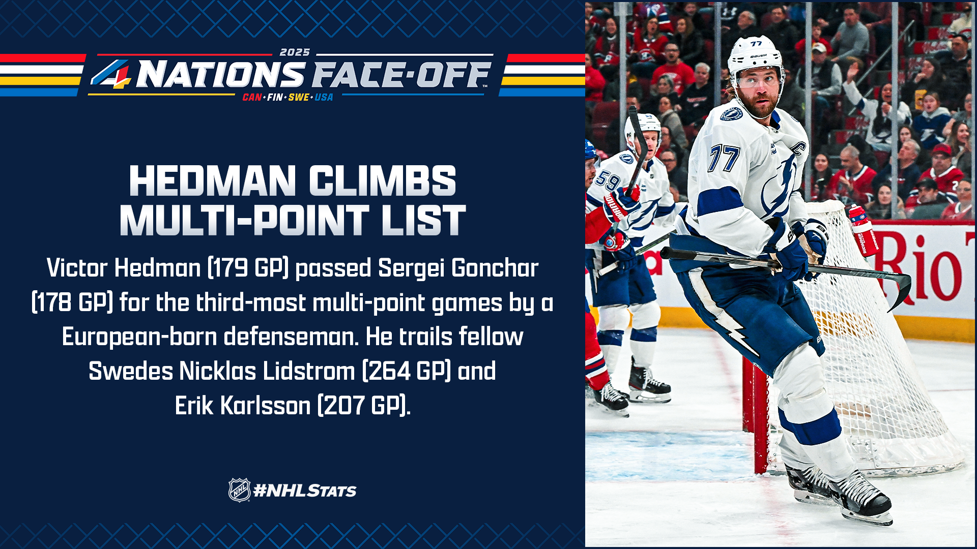 * Victor Hedman helped Tampa Bay skate to a fourth straight win while Dylan Guenther helped Utah outlast Washington in the final games before the hockey world converges upon Montreal and Boston for the 4 Nations Face-Off.