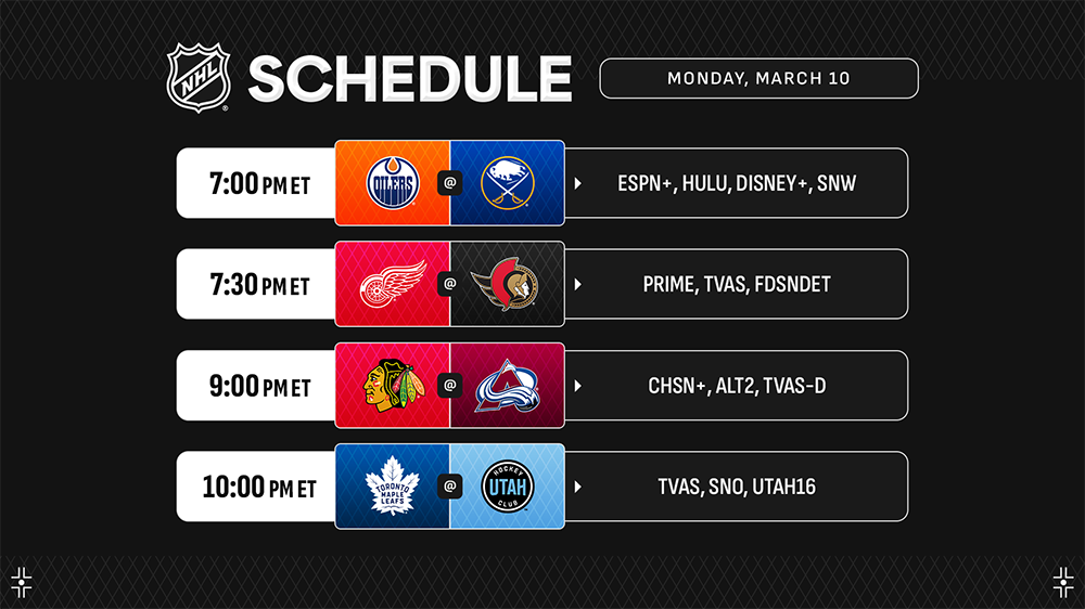 * More highlights include Leon Draisaitl also looking to extend his point streak to 15 games when the Oilers (37-22-4, 78 points) take on Tage Thompson and the Sabres (24-32-6, 54 points); Nathan MacKinnon needing one point to reach 1,000 in his career when the Avalanche (38-24-2, 78 points) clash with Connor Bedard and the Blackhawks (20-35-9, 49 points); as well as Clayton Keller and Utah Hockey Club (28-25-10, 66 points) looking to gain ground in the Western Conference’s Wild Card race when Auston Matthews and the Maple Leafs (38-22-3, 79 points) make their first visit to Delta Center.