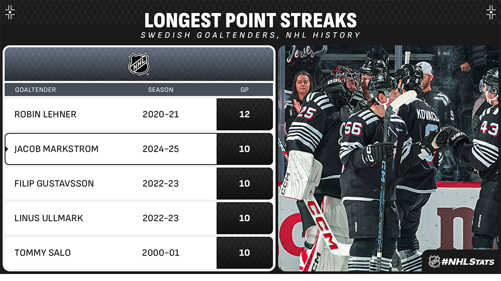 * Jacob Markstrom (SWE) made 29 saves in the Devils’ fifth straight home win as New Jersey (24-11-3, 51 points) boosted its lead atop the Metropolitan Division by defeating division rival Carolina. Markstrom extended his win streak to six games, marking the fourth longest by a goaltender in their first season with the Devils/Rockies/Scouts franchise behind Vitek Vanecek (10 GP in 2022-23), Johan Hedberg (7 GP in 2010-11) and Sean Burke (7 GP in 1987-88).
