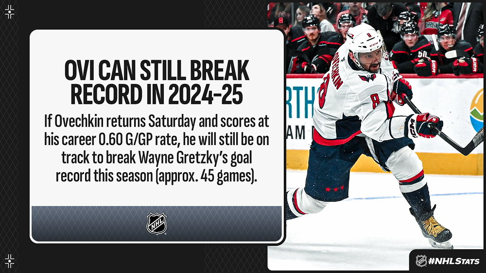 * Should Ovechkin return Saturday and stay in the lineup the remainder of the season, he would have 48 games left in the 2024-25 campaign. When Ovechkin went down with injury Nov. 18, he led the League with 15 goals and was scoring at a 0.83 goal-per-game rate. Should he continue to produce at that level, he would break the mark within the current campaign in approximately 33 games.