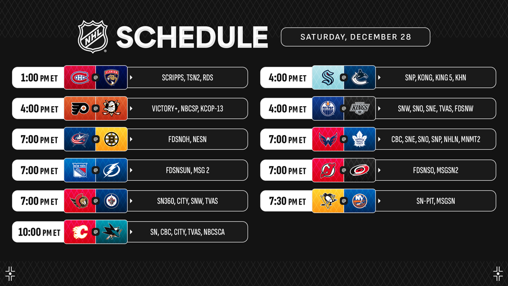 A full day of NHL action on Saturday starts early (MTL at FLA: 1 p.m. ET) and runs all day with an 11-game slate that will see each of the seven Canadian teams in action and a three-pack of contests on Sportsnet as part of Hockey Night in Canada that could include the return of Alex Ovechkin and his continued pursuit of Wayne Gretzky’s goal record (also on NHL Network).