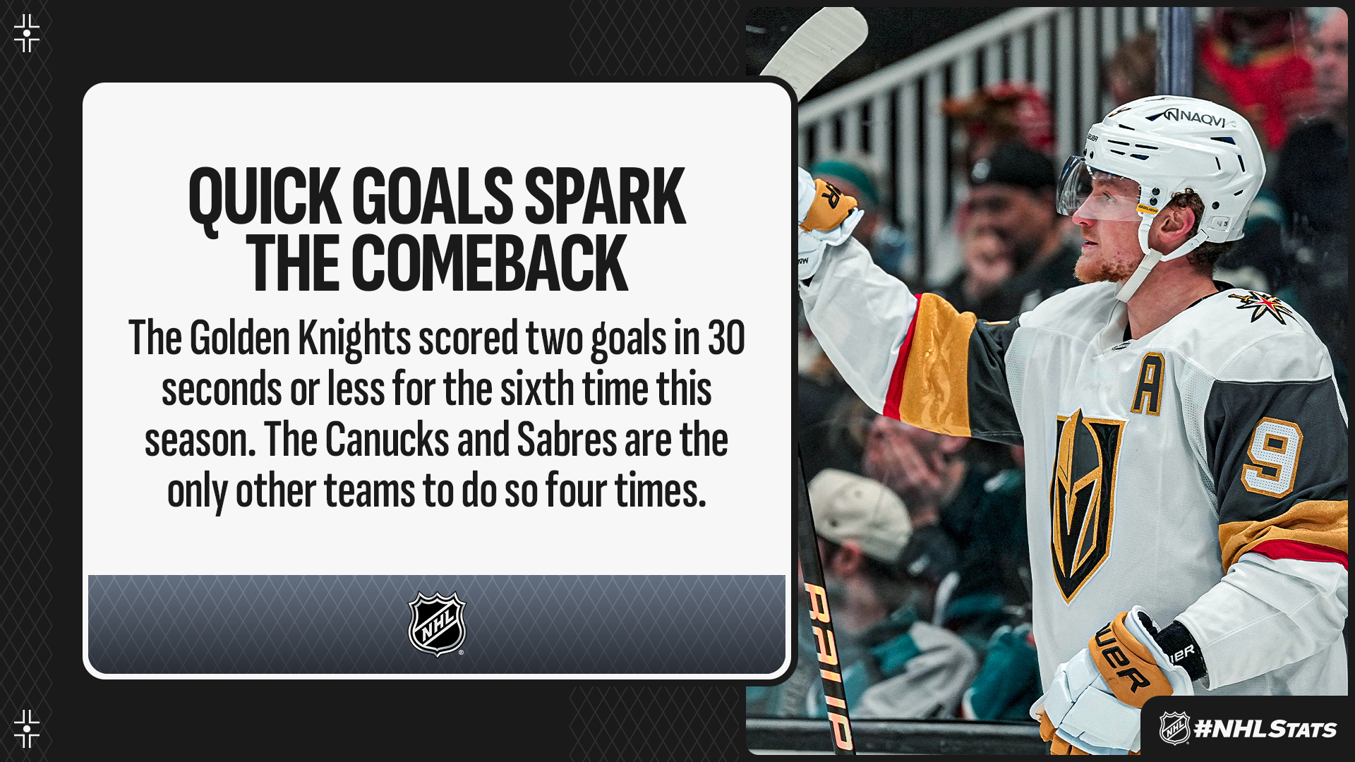 * Jack Eichel (1-1—2), one of seven Golden Knights players slated to skate at the 4 Nations Face-Off, scored one of two shorthanded goals in 23 seconds to help Vegas (24-8-3, 51 points) rally to victory and overtake idle Winnipeg (25-10-1, 51 points) for first place in the League standings by virtue of fewer games played. The Golden Knights earned their sixth third-period comeback win of the season, tied with the Ducks for second most behind only the Flyers (7).