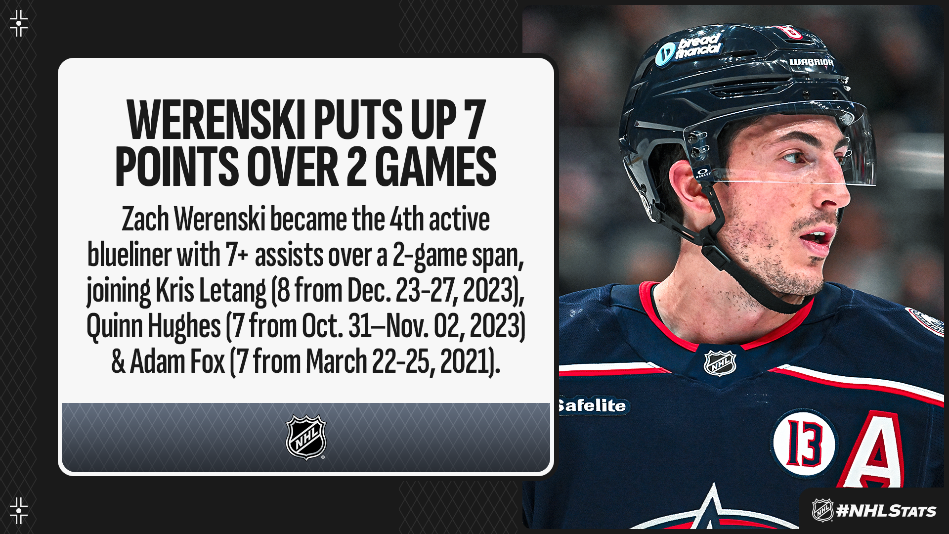 * Werenski collected his fifth career four-point game and tied Artemi Panarin for the most in Blue Jackets history. The Columbus defenseman also became the second player in franchise history with multiple four-assist outings, joining Panarin (3x).