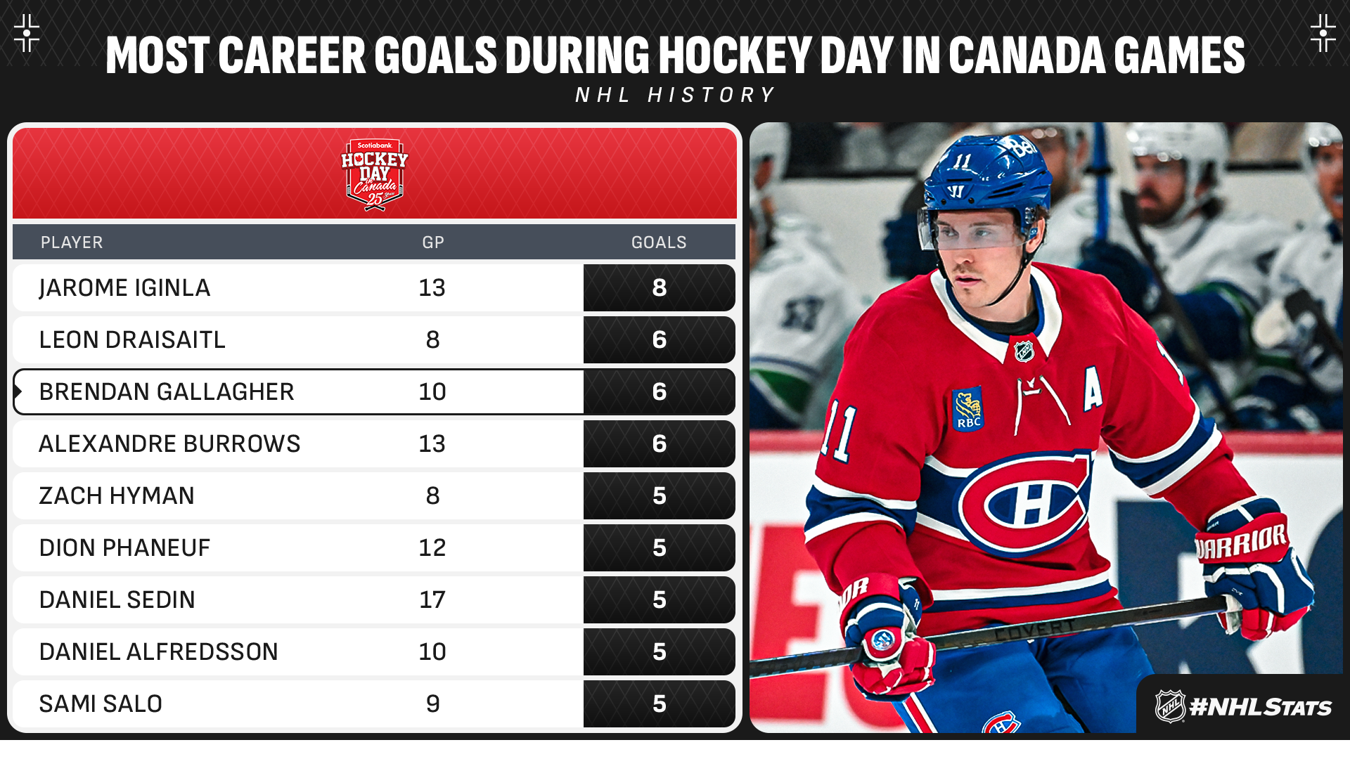 * Mitch Marner and the Atlantic Division-leading Maple Leafs (28-16-2, 58 points) clash with Nick Suzuki and the Canadiens (22-18-4, 48 points) in the 771st regular-season edition of the NHL’s oldest rivalry. Brendan Gallagher (6-2—8 in 10 GP), the longest-tenured member of Montreal’s roster, has tallied four of his six career Hockey Day in Canada goals against Toronto (Feb. 13, 2021, Feb. 9, 2019, Feb. 14, 2015 & Jan. 18, 2014).
